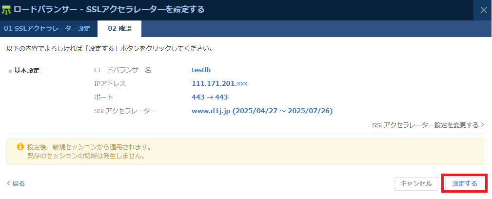 13. 「SSLアクセラレーター」から事前に設定したドメイン名を選択し、「確認へ」をクリックする。