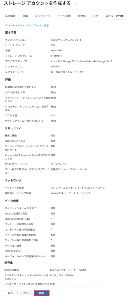 冗長化 | 「ローカル冗長ストレージ(LRS)」を選択してください。 |