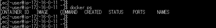 $ docker ps | ec2-userのままでdocker psコマンドを実施いたします。 正常に動作していれば問題ありません。 |