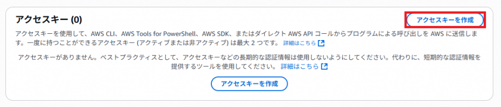 $ aws configure AWS Access Key ID [None]: AKIA3HUDTGYA6ZBC2M6R AWS Secret Access Key [None]: p8F+B0cCAJX35R1QQ3++7fvkCLAmzPrLxxxxxxx Default region name [None]: ap-northeast-3 Default output format [None]: | ec2-userでawsコマンドを実施いたします。 さきほど作成したアクセスキーやシークレットアクセスアクセスキーを入力してください。 「Default region name」は東京になりますと「ap-northeast-1」 大阪になりますと「ap-northeast-3」になります。 |