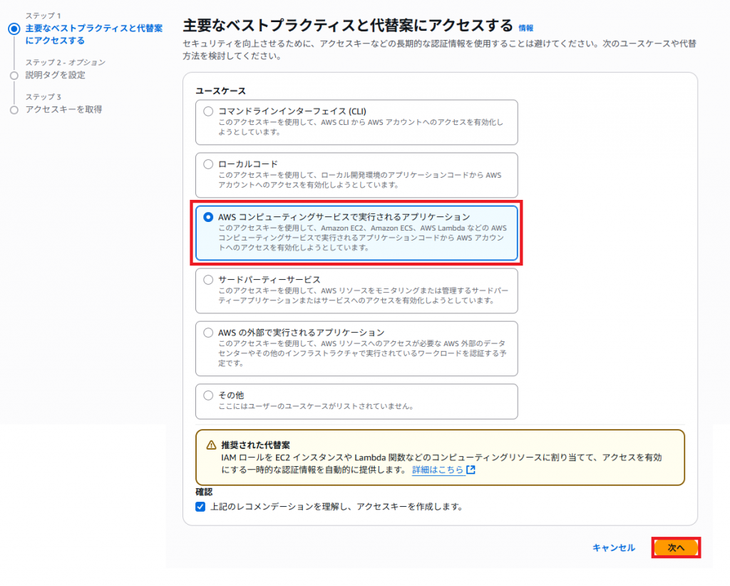 ユースケース | 「AWS コンピューティングサービスで実行されるアプリケーション」を選択してください。 |