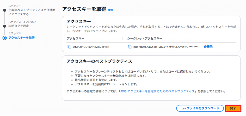 15. 「アクセスキー」「シークレットアクセスキー」をコピペしてください。