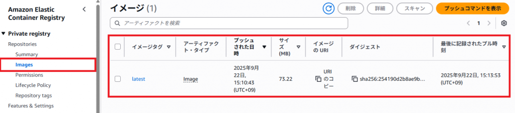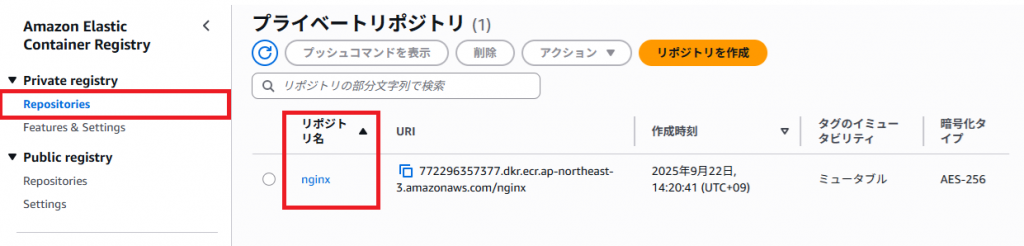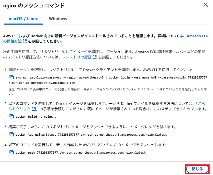 $ docker push 772296357377.dkr.ecr.ap-northeast-3.amazonaws.com/nginx:latest | 新しく作成した AWS リポジトリにこのイメージをプッシュします。 |