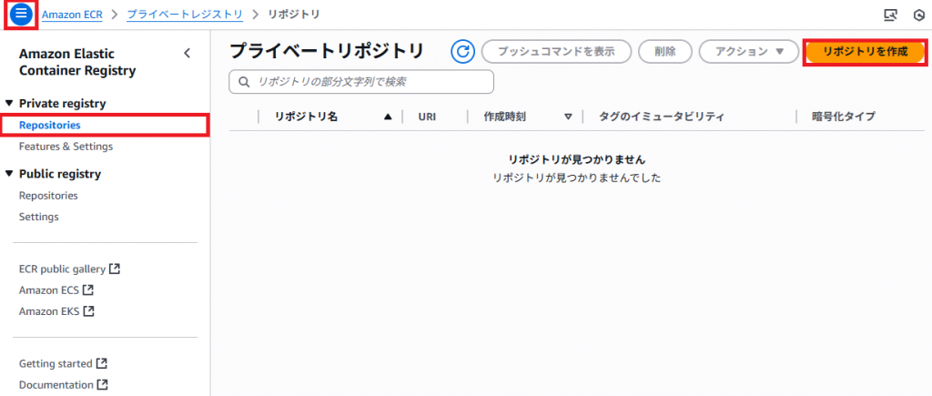 「Elastic Container Registry」→「Repositories」→「リポジトリ名」→「プッシュコマンドのを表示」になります。