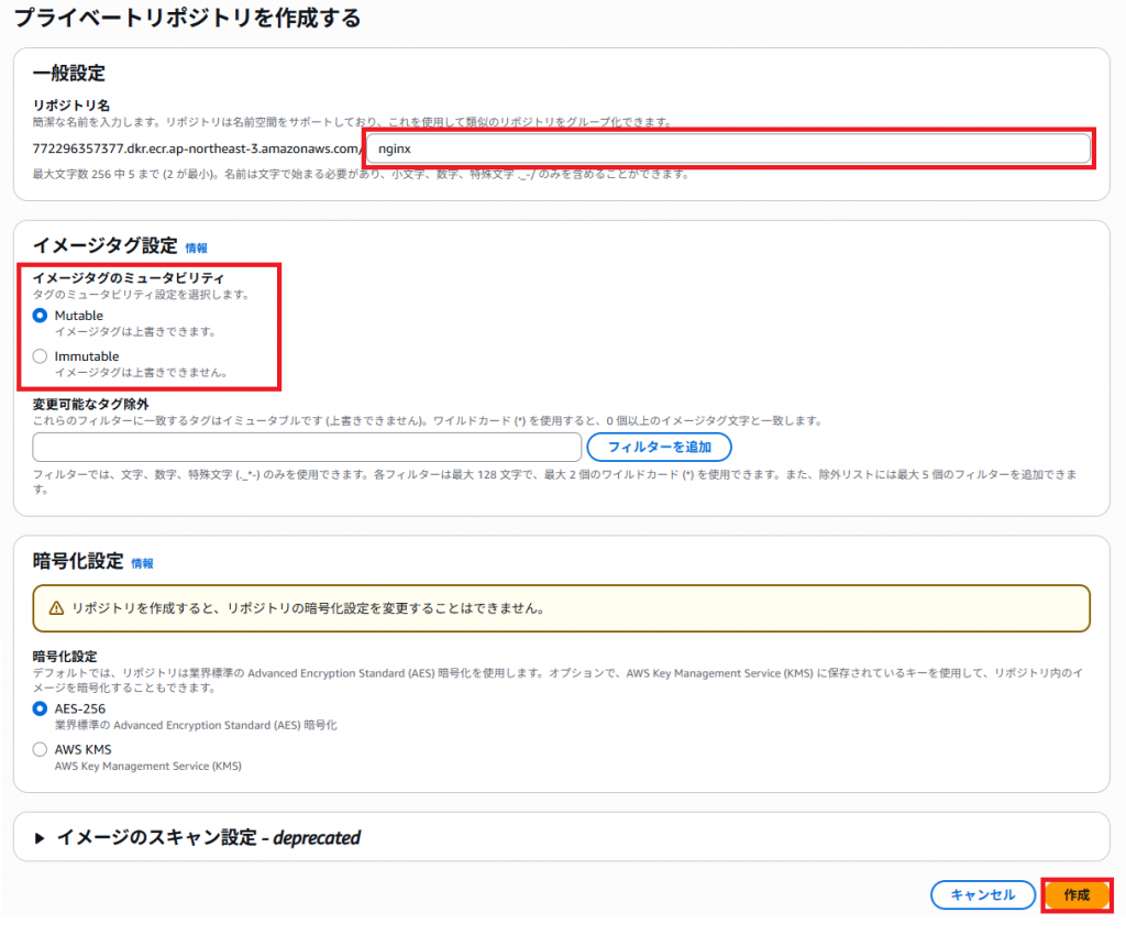 イメージタグのミュータビリティ | 「Mutable」を選択してください。 |