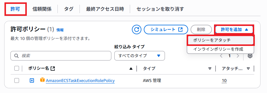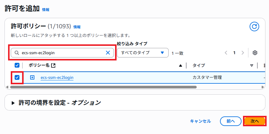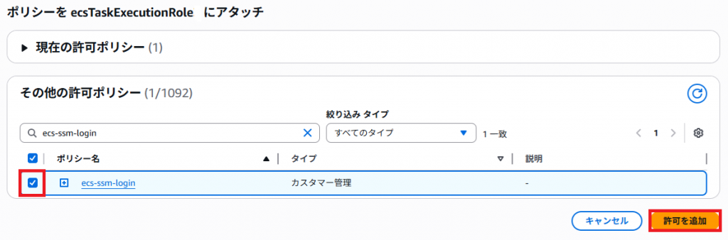 10. 検索からさきほど作成したECSログイン(ECS用)にポリシー名を検索する。