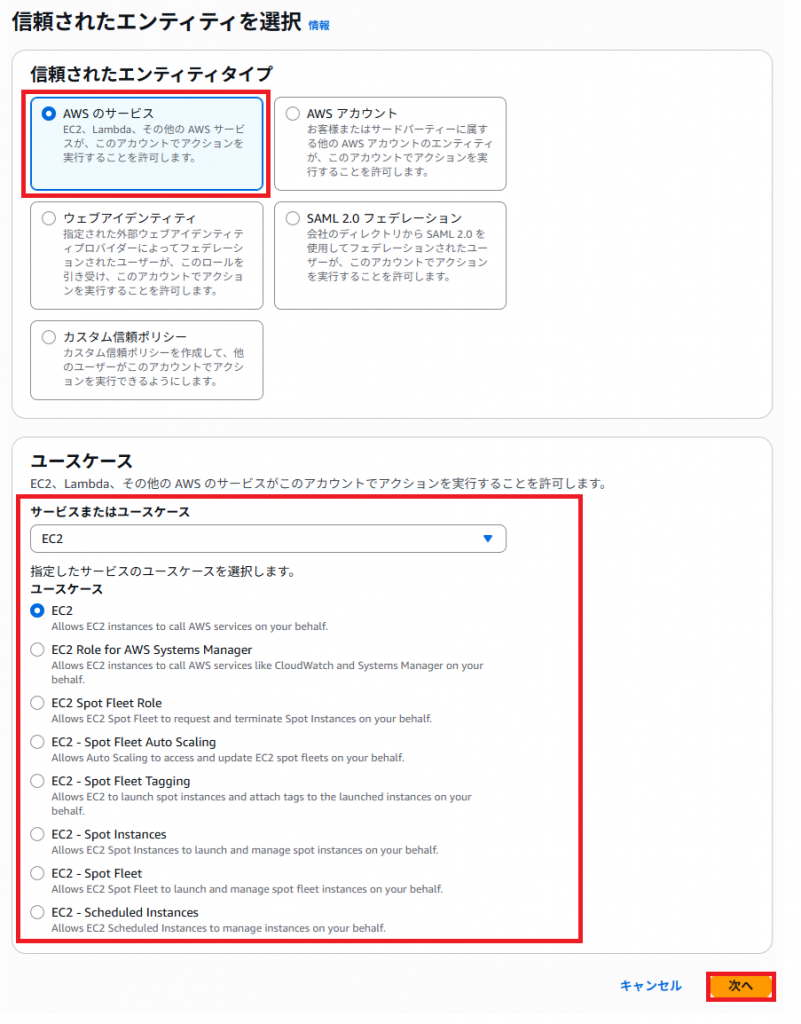 信頼されたエンティティを選択 | 「AWS のサービス」を選択してください。 |