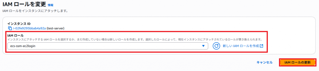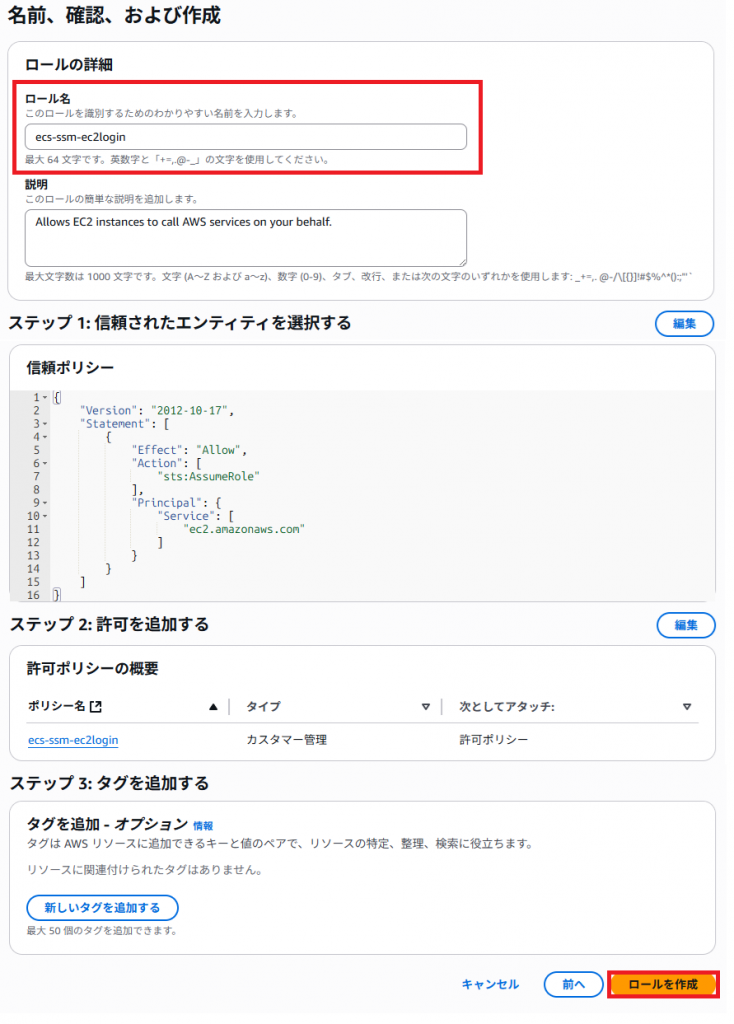 IAMロール | さきほど作成したEC2用のロールを選択いたします。 |