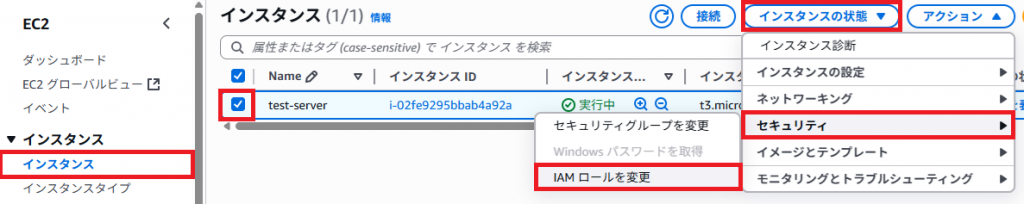 「インスタンスの状態」をクリックし「セキュリティ」をクリックし「IAMロールを変更」をクリックする。
