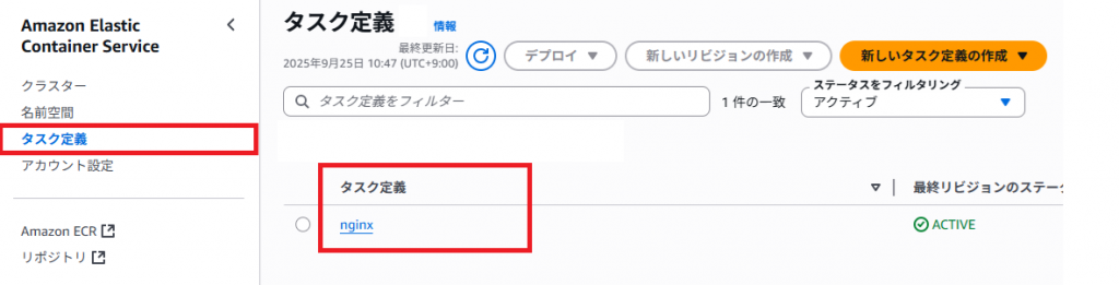19. 「タスク定義」から対象の「タスク定義」をクリックする。