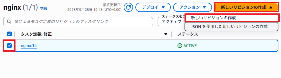 20. 対象の「タスク定義」を選択し「新しいリビジョンの作成」をクリックする。