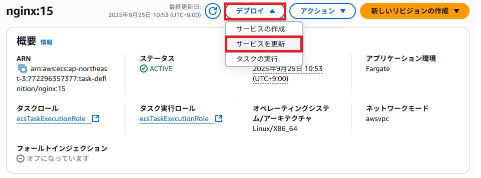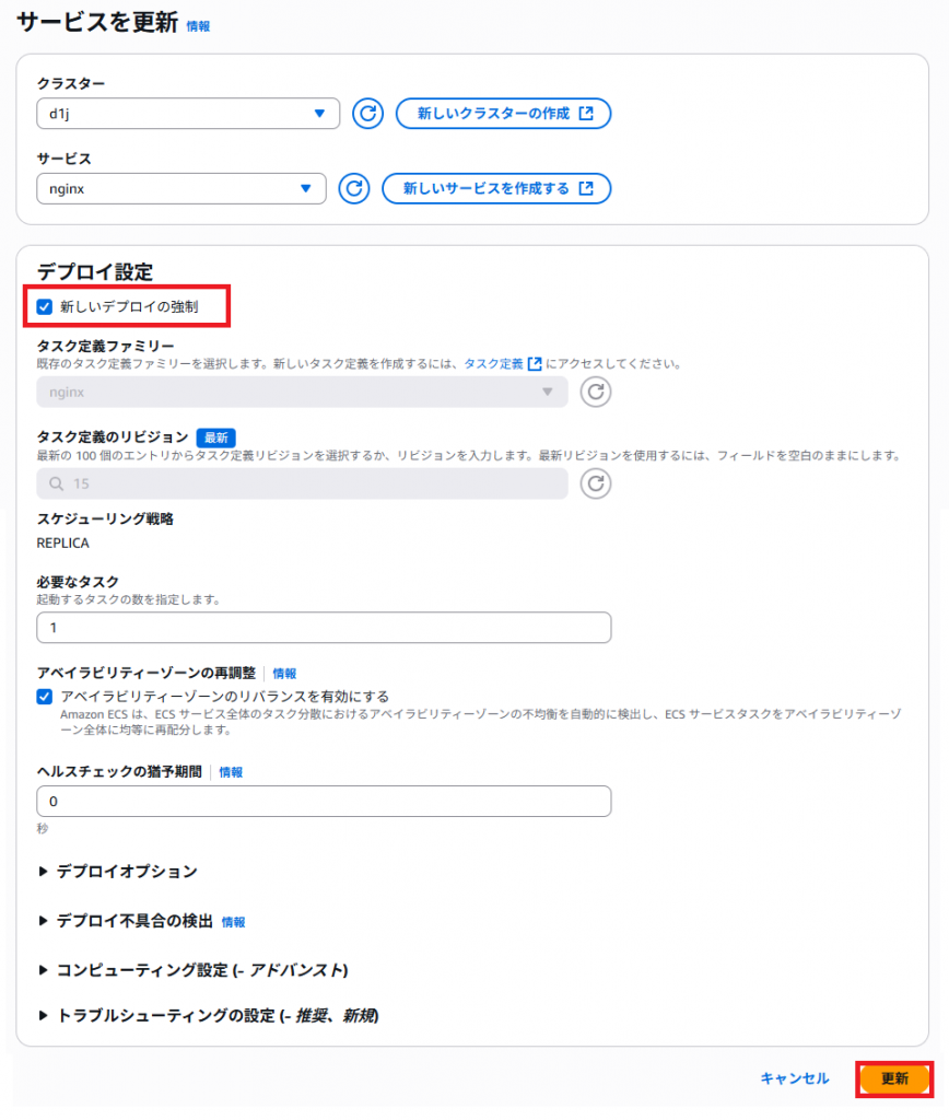 $ aws ecs update-service --cluster d1j --service nginx --force-new-deployment | 強制デプロイをいたします。数分間まってください。 |