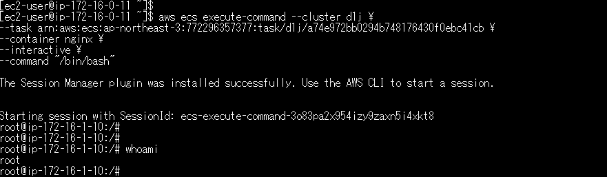 $ aws ecs execute-command --cluster d1j \ --task arn:aws:ecs:ap-northeast-3:772296357377:task/d1j/a74e972bb0294b748176430f0ebc41cb \ --container nginx \ --interactive \ --command "/bin/bash" | リモート接続をしてみます。 |