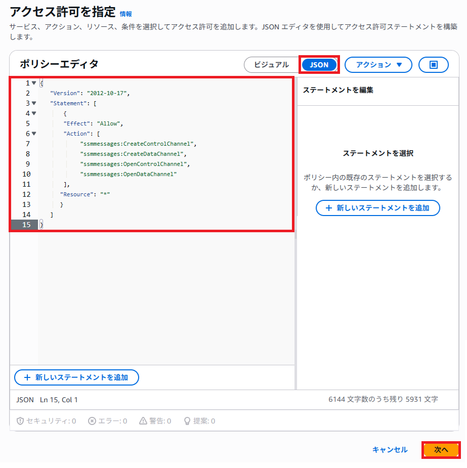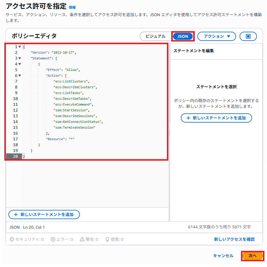 3. 「JSON」をクリックしてポリシーエディタをコピペいたします。