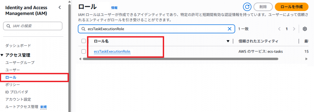 ECS起動時に利用したロールになります。対象の「ロール名」をクリックする。