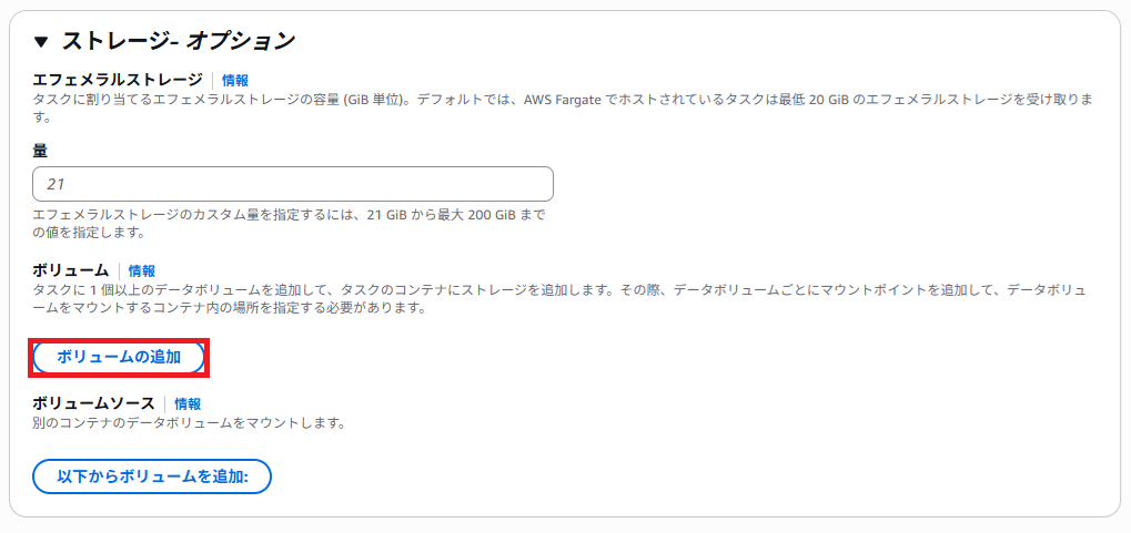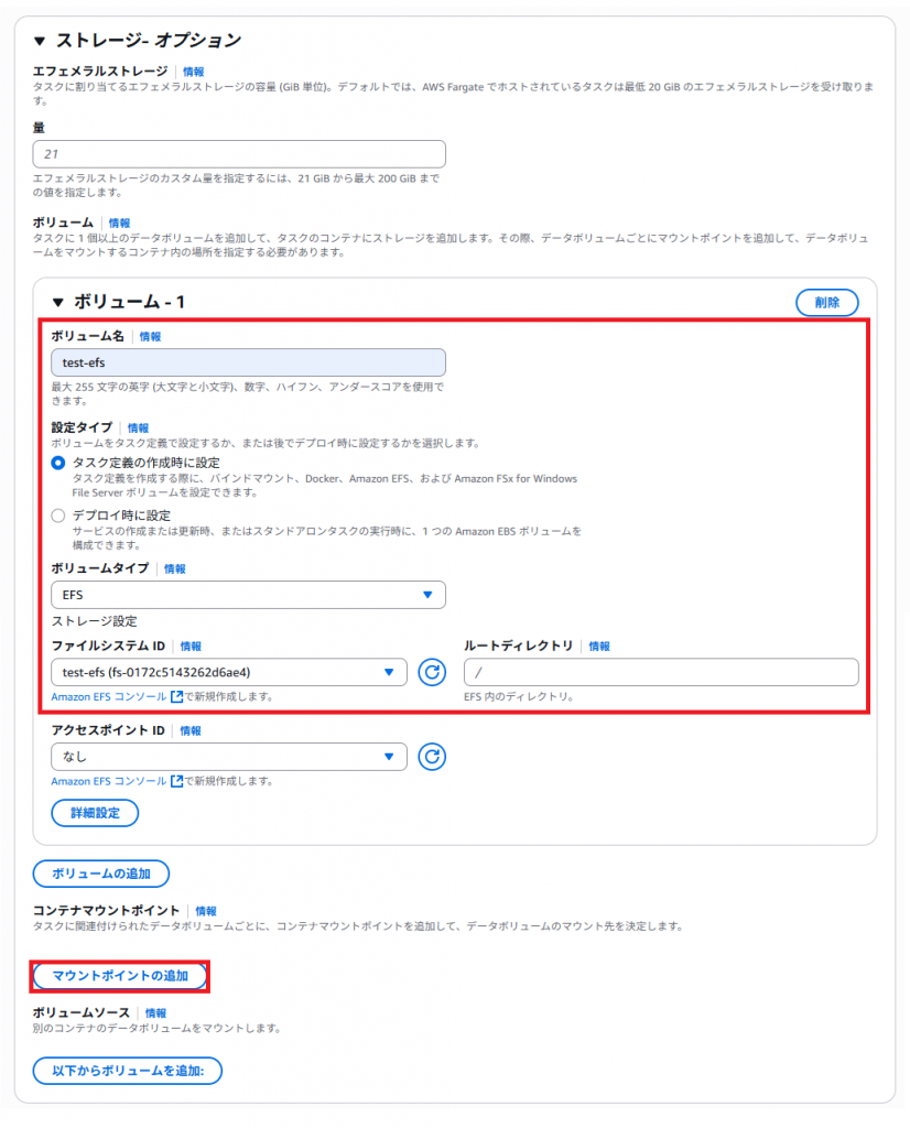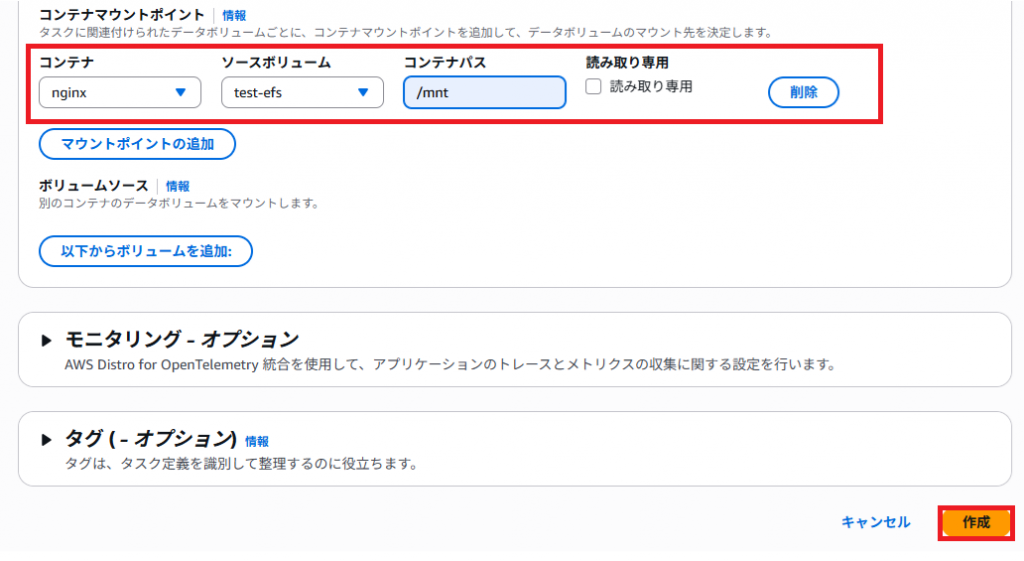 コンテナパス | 「/mnt」を入力してください。 EFSをマウントしたいディレクトリを入力してください。 |