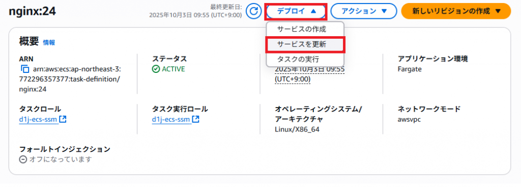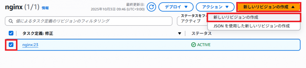 11. 対象の「タスク定義:修正」を選択し「新しいリビジョンの作成」をクリックし
