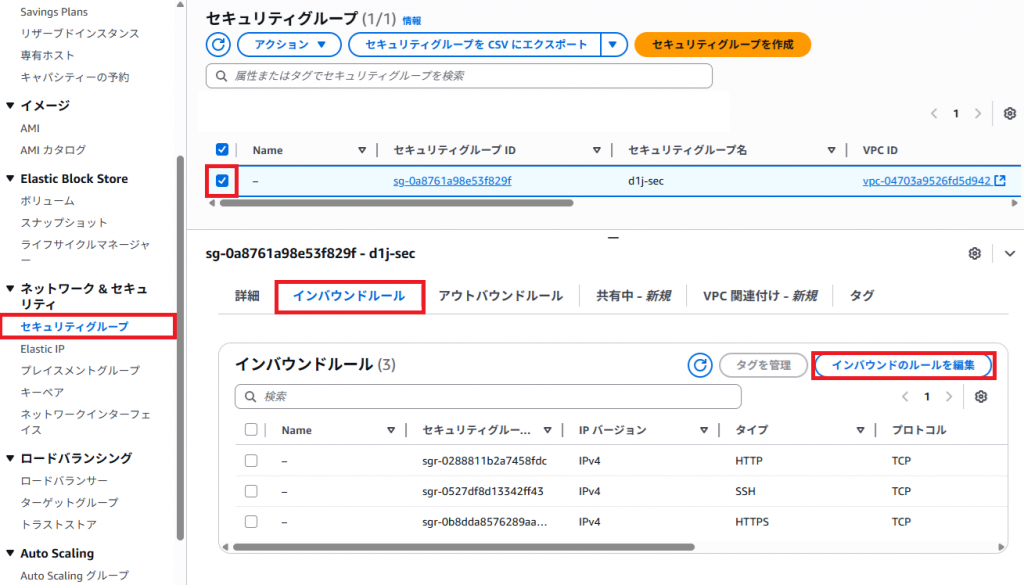 8. 左側「セキュリティグループ」をクリックし対象のセキュリティグループを選択する。