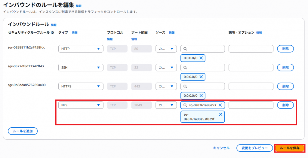 ソース | 「カスタム」を選択いたします。 右側をクリックして「セキュリティグループ」から 「セキュリティグループ名」を選択いたします。 ※ECS利用している同じセキュリティグループ名で問題ありません。 |