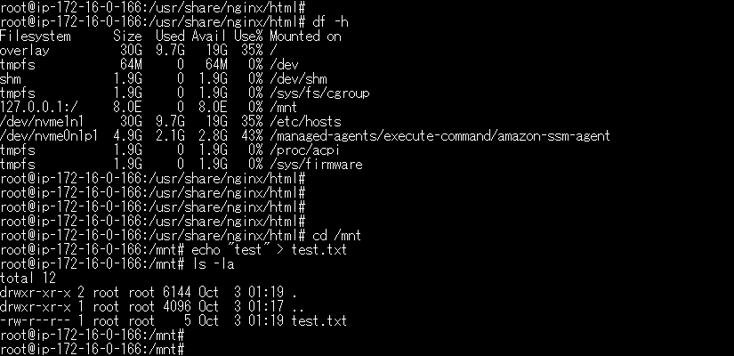 16. EC2サーバーからECS FargateにログインしてEFSを確認いたします。