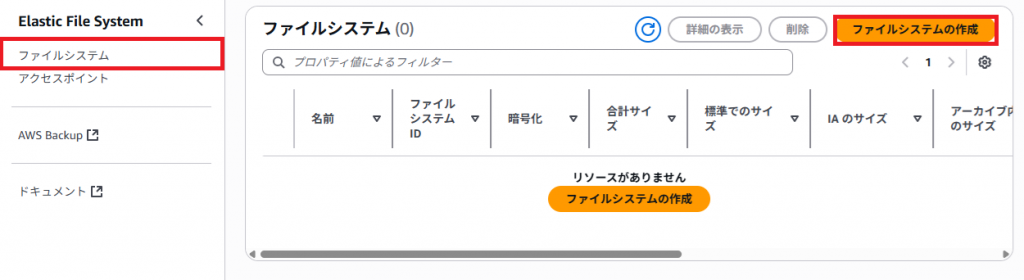 2. 「ファイルシステム」をクリックし「ファイルシステムの作成」をクリックする。