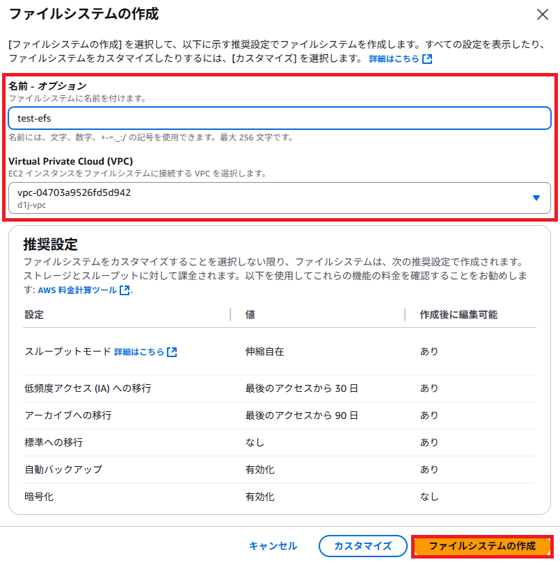 3. 入力、選択し「ファイルシステムの作成」をクリックする。
