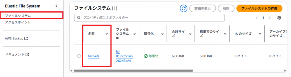 4. 「ファイルシステム」をクリックし対象の「名前」をクリックする。