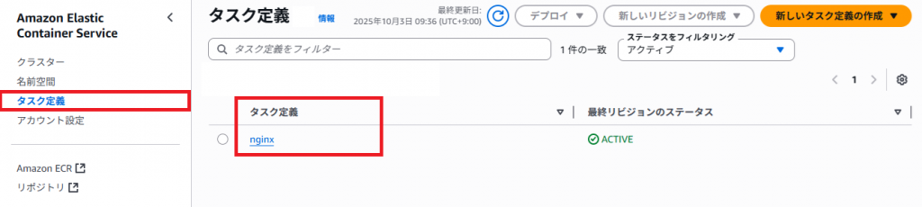 11. 「タスク定義」をクリックし対象の「タスク定義」をクリックする。