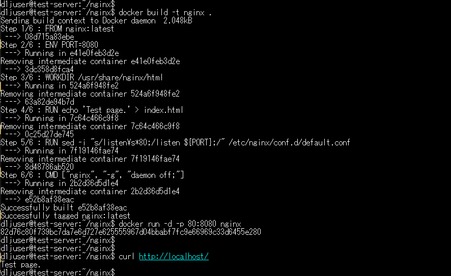 | $ cd nginx $ vi Dockerfile FROM nginx:latest ENV PORT=8080 WORKDIR /usr/share/nginx/html RUN echo 'Test page.' > index.html RUN sed -i "s/listen\s*80;/listen ${PORT};/" /etc/nginx/conf.d/default.conf CMD ["nginx", "-g", "daemon off;"] | 対象ディレクトリに移動して、viでDockerfileを作成いたします。 ※viでコピペがうまく貼り付けない場合は下記の内容を試してください。 ホームディレクリに作成してください。 $ vi .vimrc set mouse-=a |