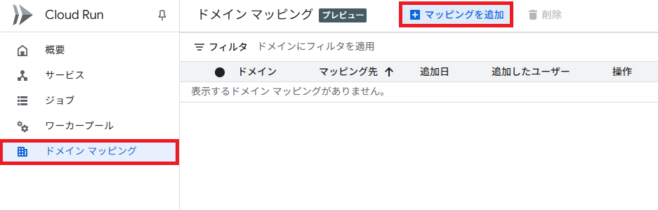 10. 再度、「ドメイン マッピング」をクリックし「マッピングを追加」をクリックする。