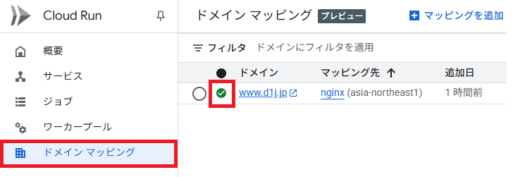 13. 「ドメイン マッピング」をクリックしアイコンが緑なっていれば正常に反映されています。