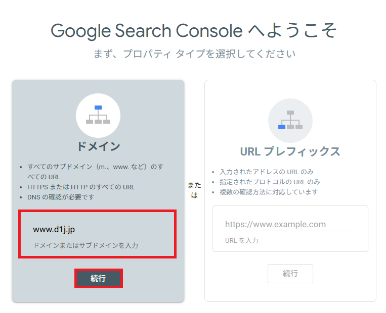 6. 利用したい独自ドメインを入力してください。「続行」をクリックする。