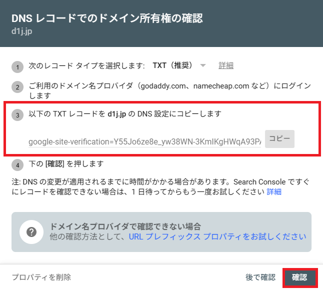 7. 独自ドメインのDNSを管理しているサービスでTXTを追加してください。