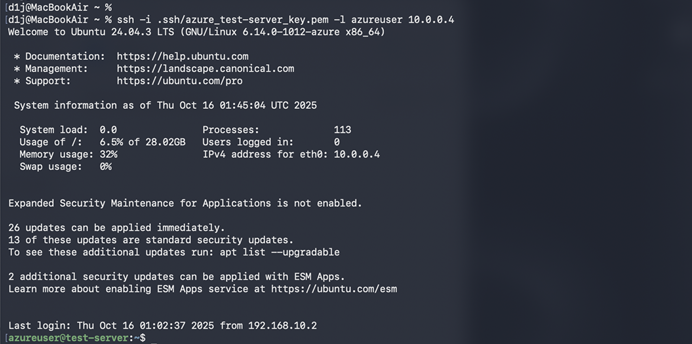 | ssh -i .ssh/azure_test-server_key,pem -l azureuser 10.0.0.4 | SSHでログインいたします。 対象サーバー接続用のSSHキーやIPアドレスを入力してください。 |