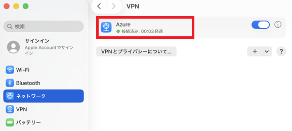 以上で「Microsoft Azure VPN Gateway(P2S)macOS設定方法」を完了いたします。