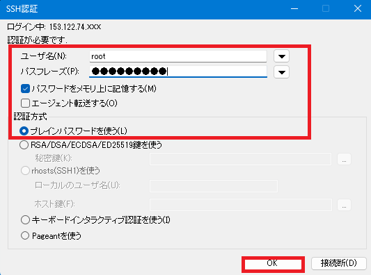 | パスフレーズ | サーバー作成時に発行されたパスワードになります。 |