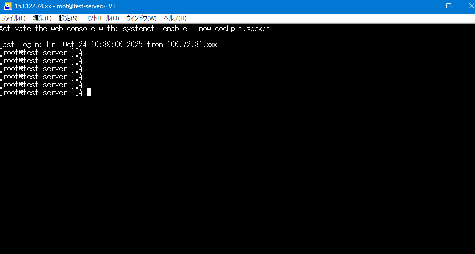 ssh -l root 153.122.74.xxx | 対象サーバーのIPアドレスを指定してください。 ※ユーザーは「root」ユーザーになります。作成時に発行されたパスワードです。 |
