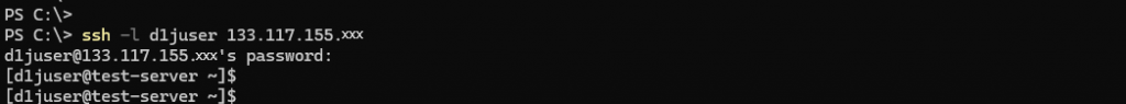 | ssh -l d1juser 133.117.155.xxx | SSH接続をいたします。 ユーザー名とグローバルIPアドレスを指定してください。 パスワードを入力してください。 |