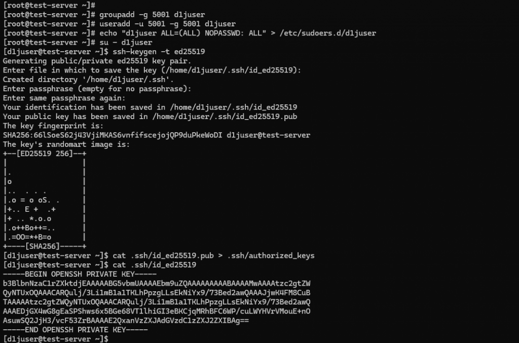 | # echo "d1juser ALL=(ALL) NOPASSWD: ALL" > /etc/sudoers.d/d1juser | sudoの権限を付与いたします。 |
