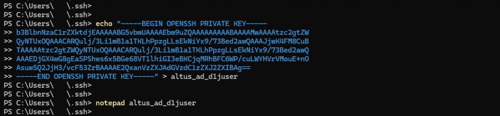 | echo "-----BEGIN OPENSSH PRIVATE KEY----- b3BlbnNzaC1rZXktdjEAAAAABG5vbmUAAAAEbm9uZQAAAAAAAAABAAAAMwAAAAtzc2gtZW QyNTUxOQAAACARQulj/3Li1mB1a1TKLhPpzgLLsEkNiYx9/73Bed2awQAAAJjwK4FM8CuB TAAAAAtzc2gtZWQyNTUxOQAAACARQulj/3Li1mB1a1TKLhPpzgLLsEkNiYx9/73Bed2awQ AAAEDjGX4wG8gEaSPShws6x5BGe68VT1lhiGI3eBKCjqMRhBFC6WP/cuLWYHVrVMouE+nO AsuwSQ2JjH3/vcF53ZrBAAAAE2QxanVzZXJAdGVzdC1zZXJ2ZXIBAg== -----END OPENSSH PRIVATE KEY-----" > altus_ad_d1juser | さきほどSSHキー(秘密鍵)をコピペしたもとを echo "SSHキー(秘密鍵) "> altus_ad_d1juser でファイルを作成いたします。 ※正常にコピペができない場合は、一度メモ帳にコピペしたから powershellに張り付けましょう。 |