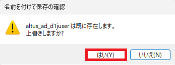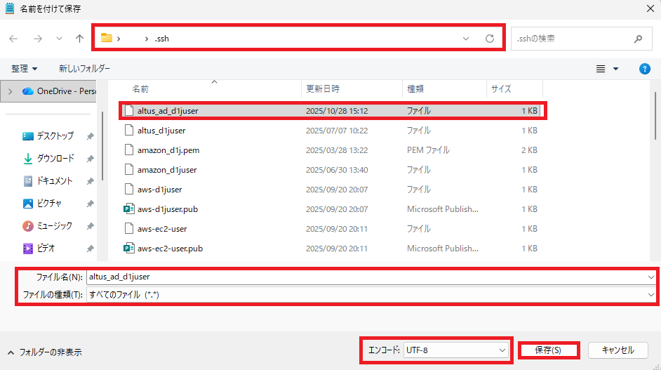 | notepad altus_d1juser | メモ帳で作成したSSHキーを開きます。 「ファイル」から「名前付けて保存」をクリックする。 ホームディレクトリの.sshフォルダ場所に移動して、 「ファイルの種類」は「すべてのファイル」にして、 さきほど作ったSSHキー(秘密鍵)を選択して、「文字コード」を 「UTF-8」にして「保存」をクリックする。 ※この上書きをでUTF-8に変更しないと動作しない場合があります。 |
