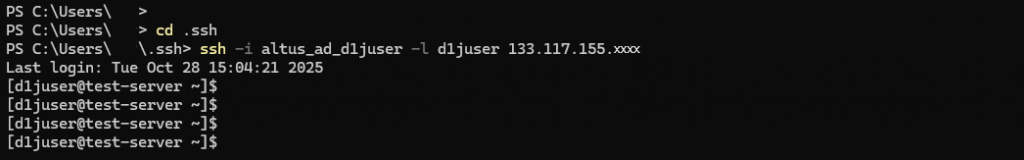 | ssh -i altus_d1juser -l d1juser 133.117.155.xxx | SSH接続をいたします。 さきほど作ったSSHキーとユーザー名とグローバルIPアドレスを指定してください。 |