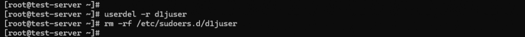 | # rm -rf /etc/sudoers.d/d1juser | sudoの権限を削除いたします。 |