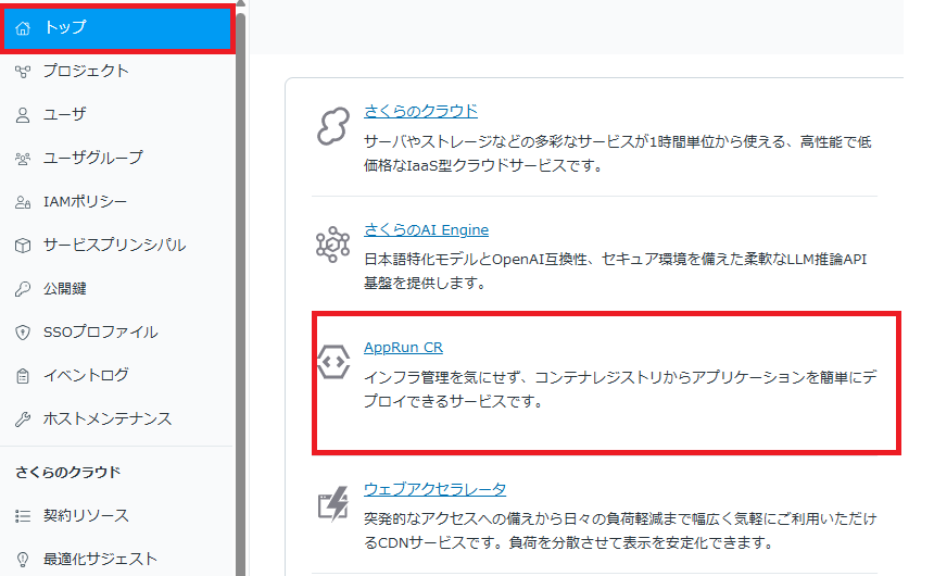 「トップ」をクリックし「AppRun CR」をクリックする。