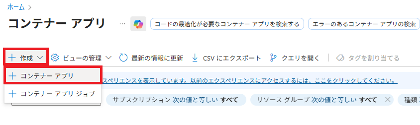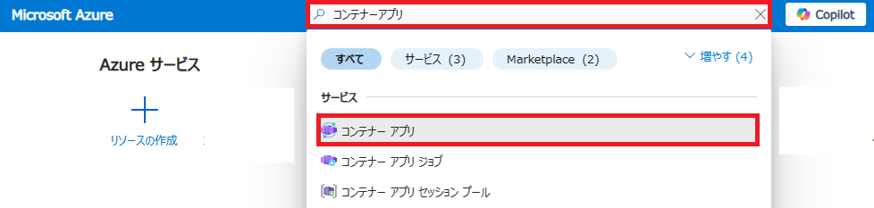 1. ブラウザーでAzure portalから検索窓から「コンテナーアプリ」を検索してください。