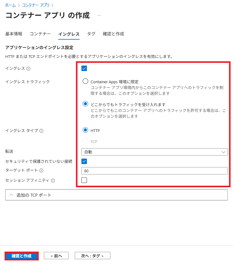 5. 入力、選択したら「確認と作成」をクリックする。