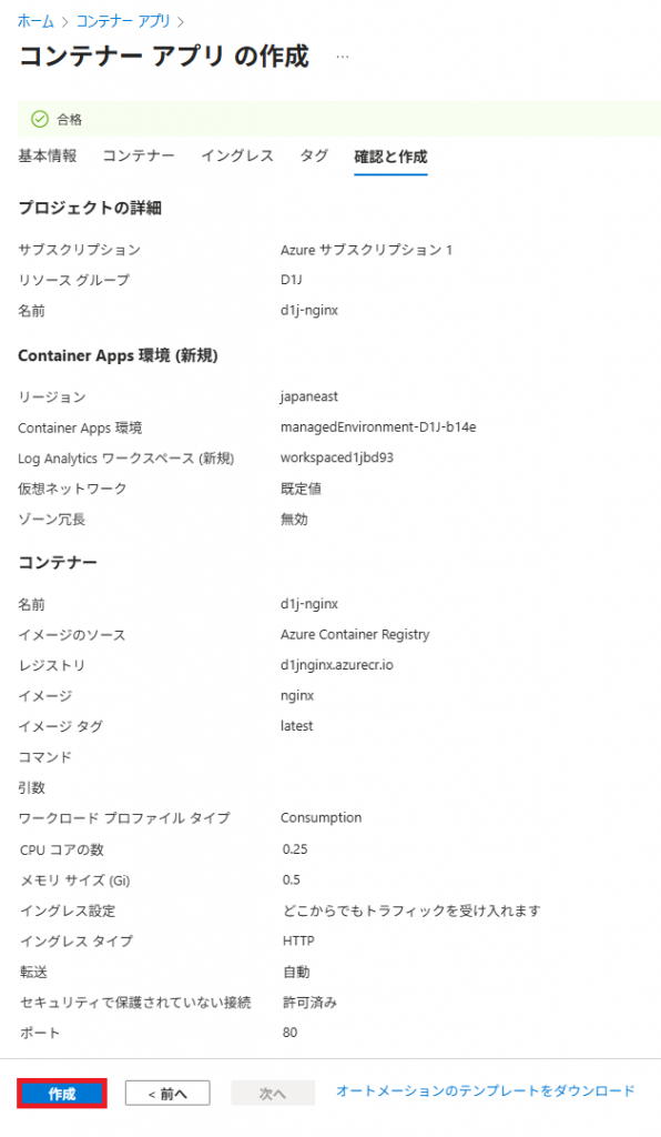 6. 確認後、「作成」をクリックする。