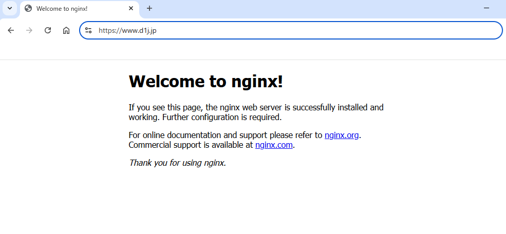 | # certbot certonly --webroot -w /usr/share/nginx/html -d www.d1j.jp --key-type rsa --cert-name www.d1j.jp --register-unsafely-without-email --agree-tos -n | ドメイン名はDNSに登録したドメインを入力してください。 -d のあとは利用したいドメイン名(FQDN)になります。 /usr/share/nginx/htmlの配下にLet's Encrypt認証ファイルが作成されます。 Nginxは起動状態にいたします。(80番ポート利用します。) --cert-nameは内部ファイルのラベルになります。 |