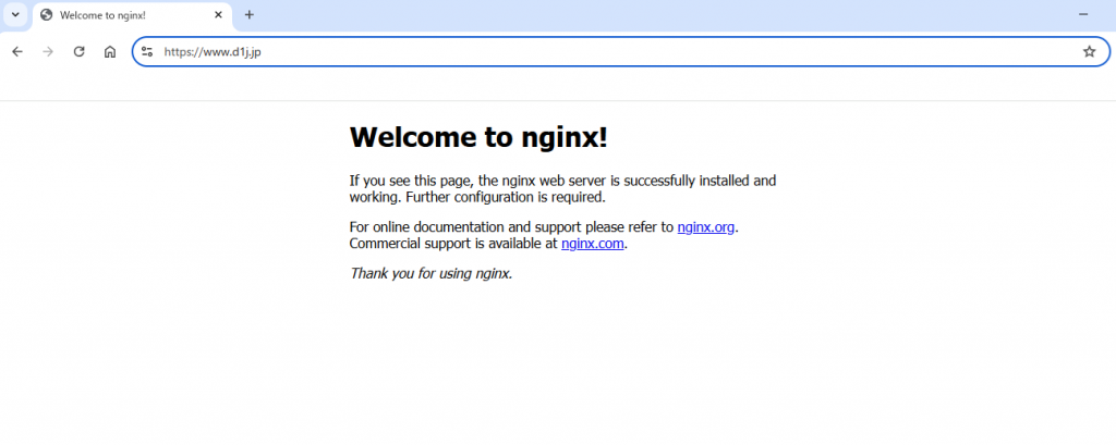 | # certbot certonly --webroot -w /var/www/html -d www.d1j.jp --key-type rsa --cert-name www.d1j.jp --register-unsafely-without-email --agree-tos -n | ドメイン名はDNSに登録したドメインを入力してください。 -d のあとは利用したいドメイン名(FQDN)になります。 /var/www/htmlの配下にLet's Encrypt認証ファイルが作成されます。 Nginxは起動状態にいたします。(80番ポート利用します。) --cert-nameは内部ファイルのラベルになります。 |
