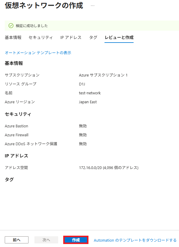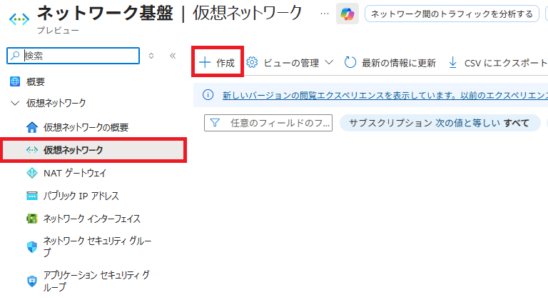 2. 「仮想ネットワーク」をクリックし「作成」をクリックする。